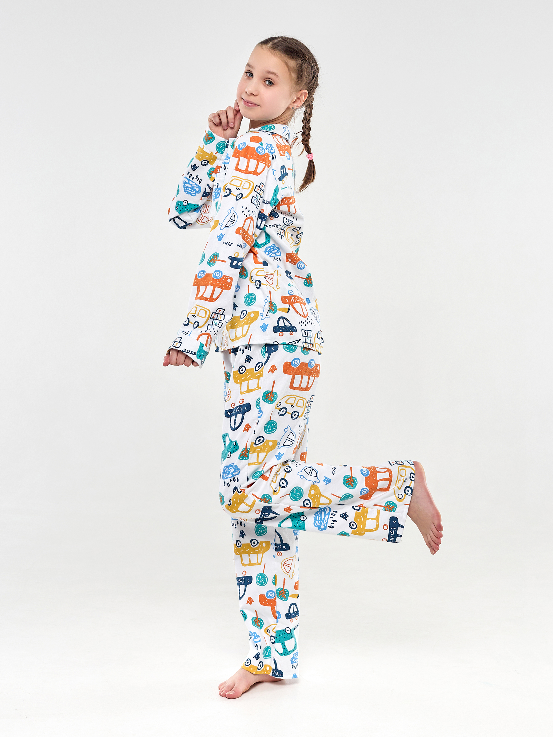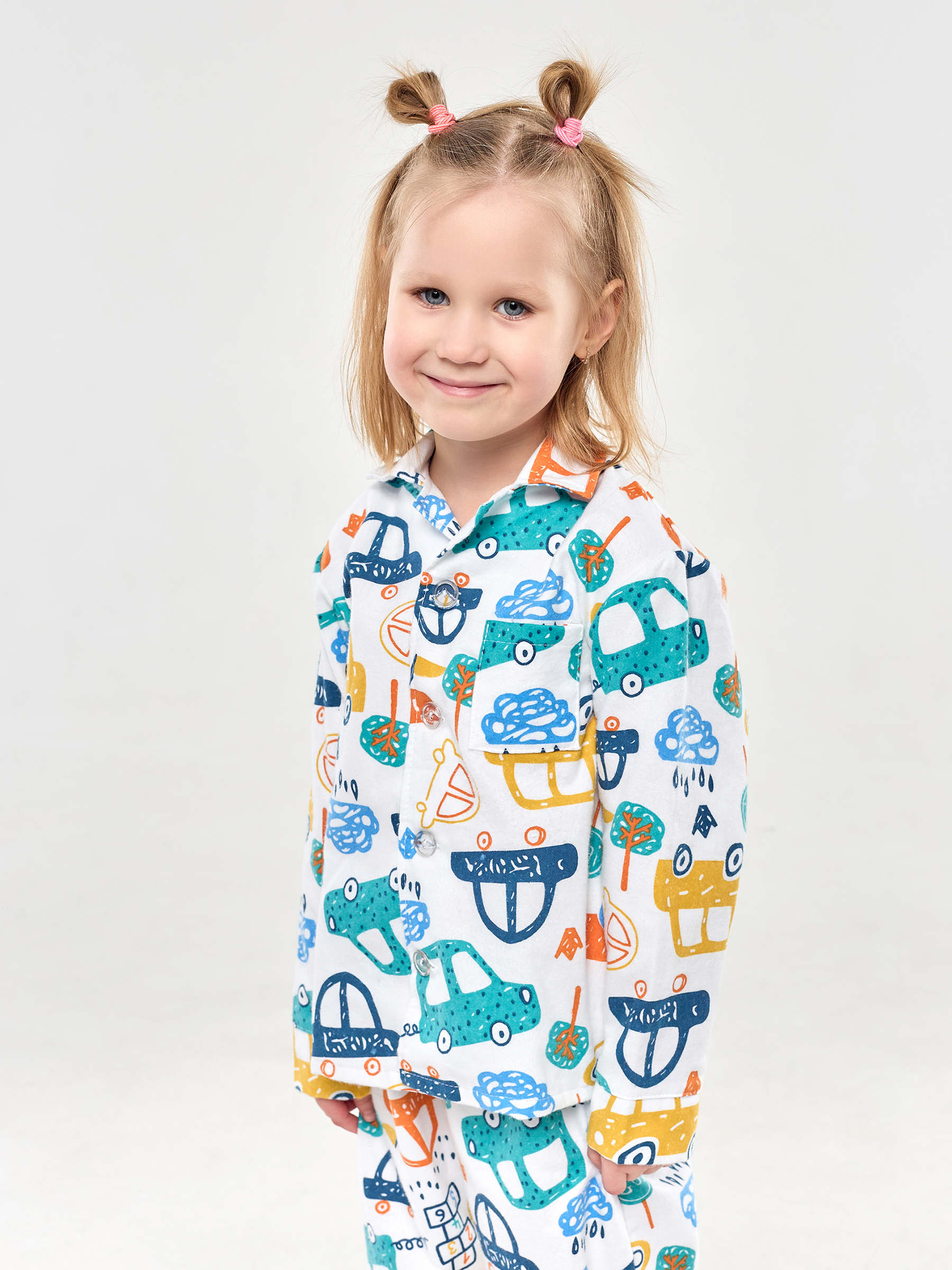 Пижама детская свободного кроя не будет стеснять движения во время активных, а также спокойных игр дома, состоит из длинных свободных штанов на резинке и рубашки с длинным рукавом на пуговицах.