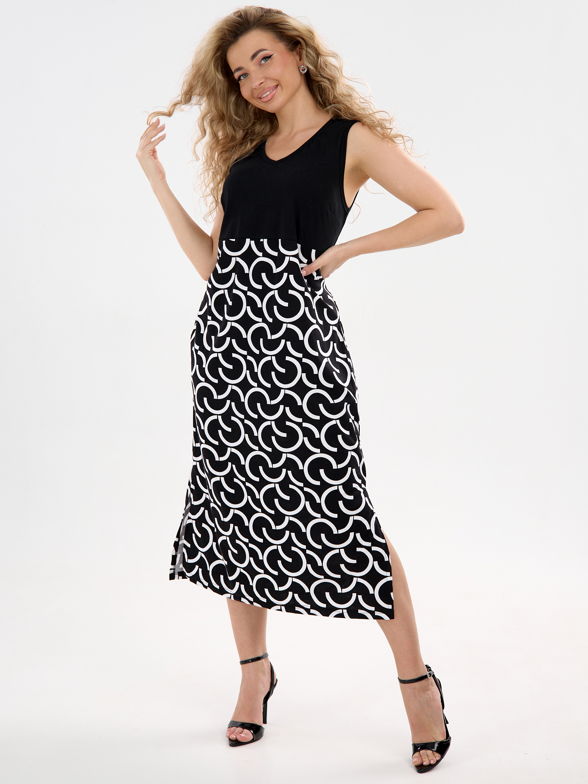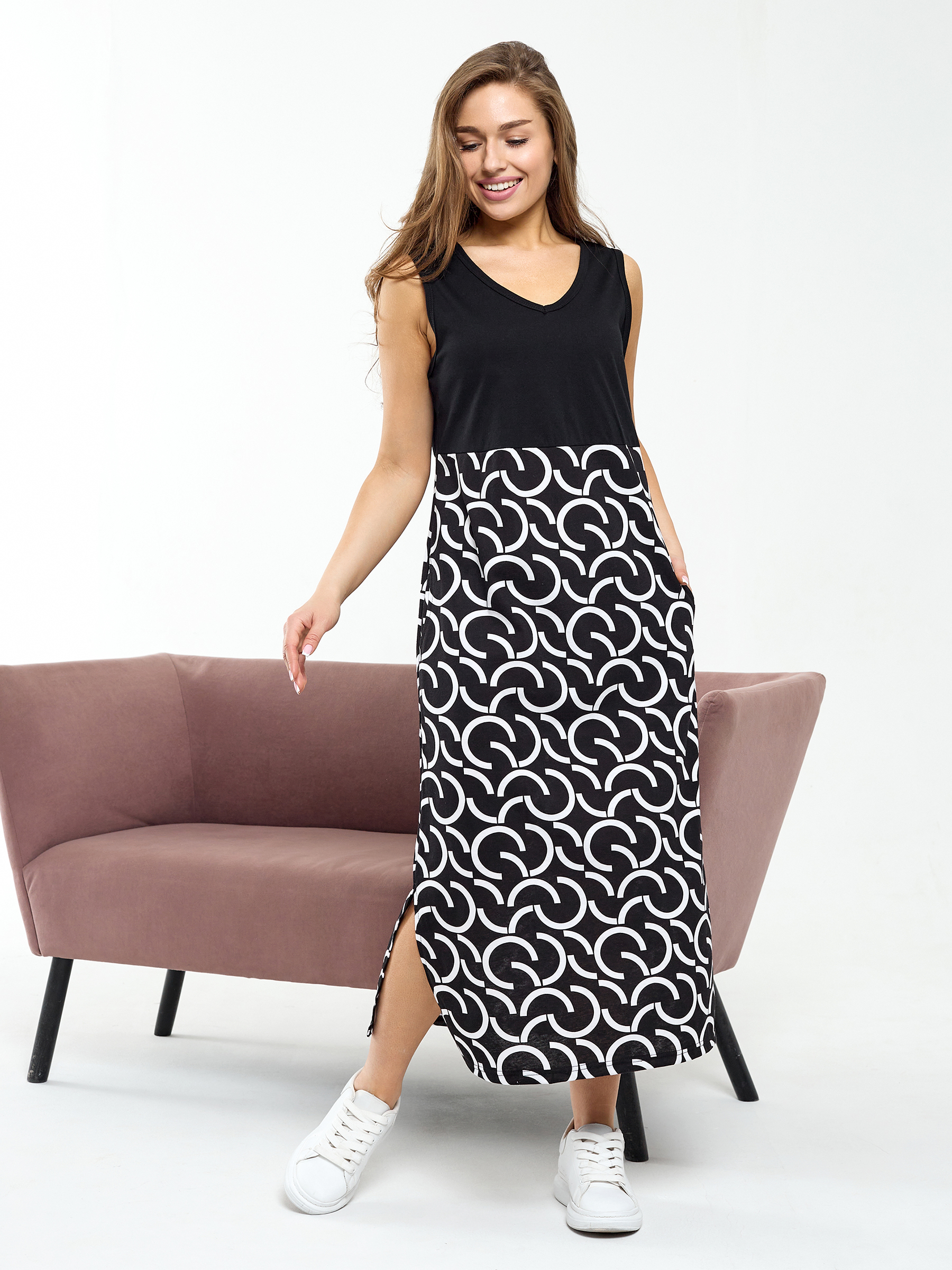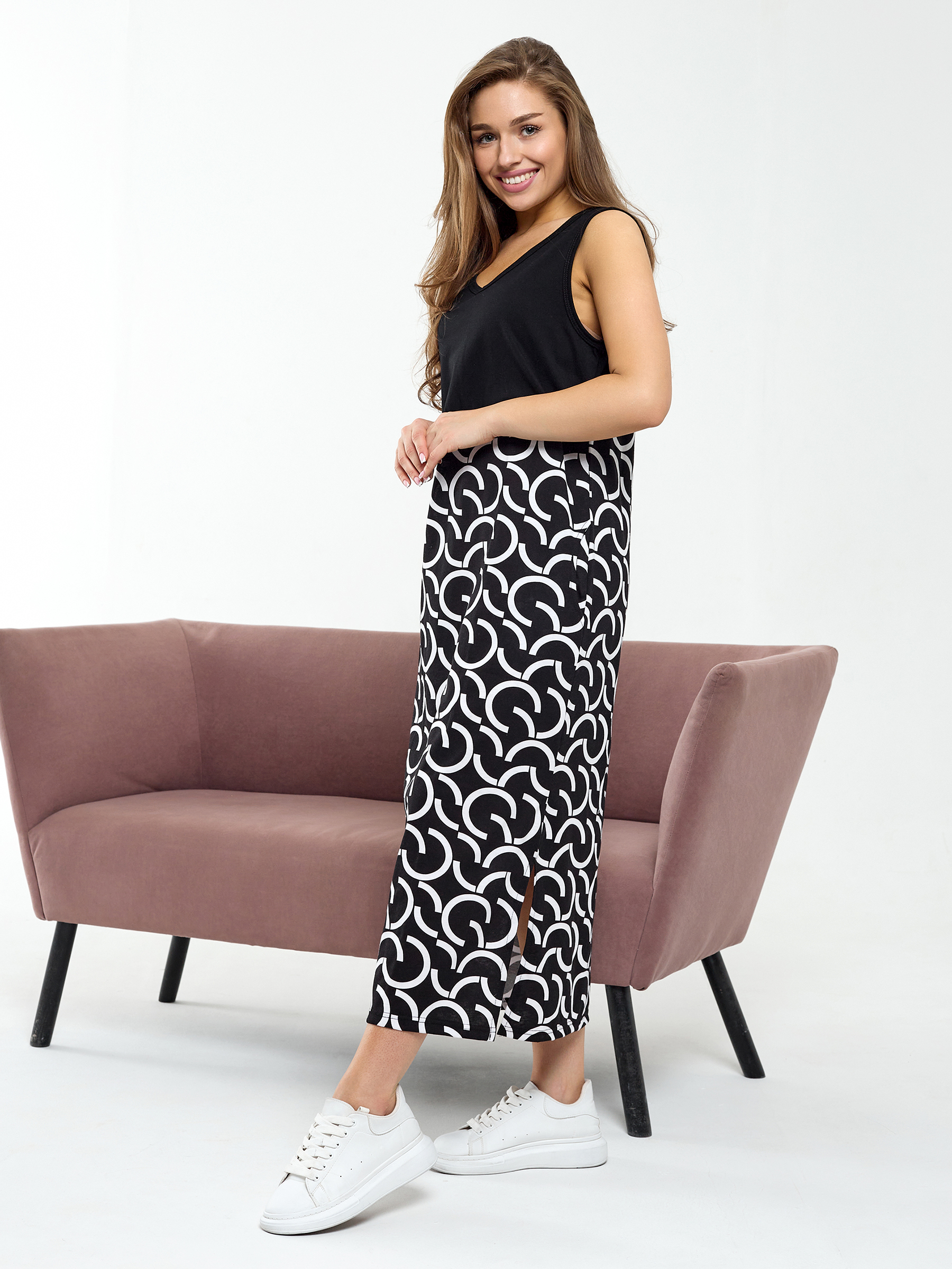 Сарафан домашний трикотажный с v- образным вырезом, благодаря оригинальному принту, скрадывает все недостатки фигуры.